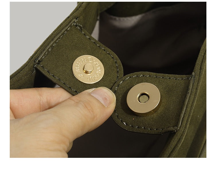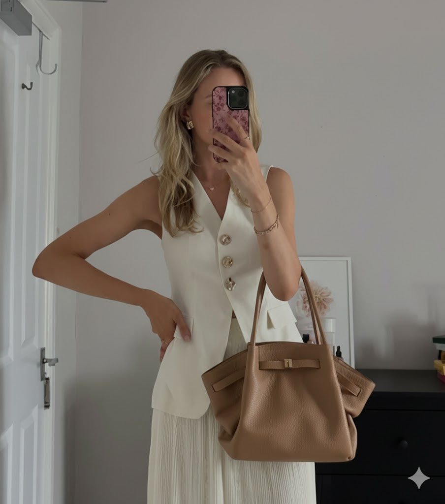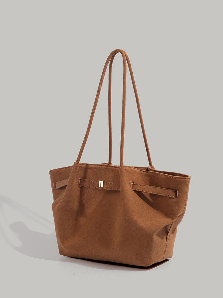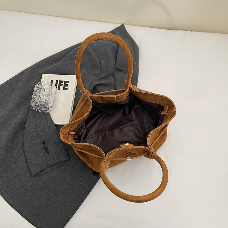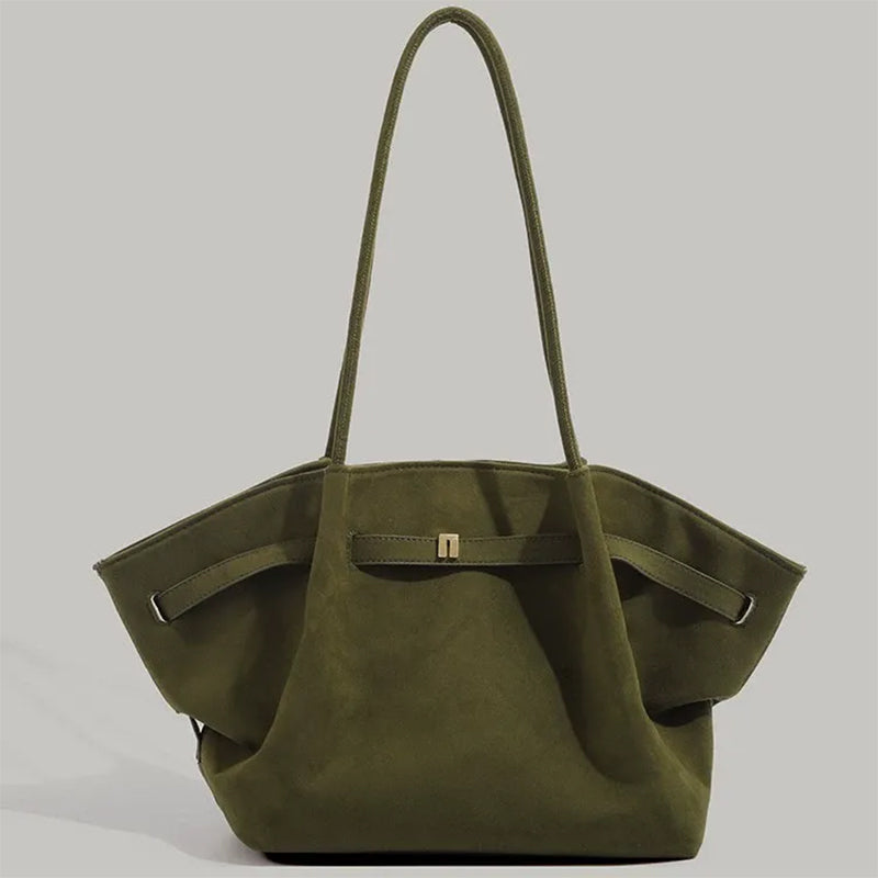 Morbida eleganza vegana: pelle scamosciata cruelty-free, design fluido e versatile, perfetta dal giorno alla sera con manici resistenti e capienza su misura.