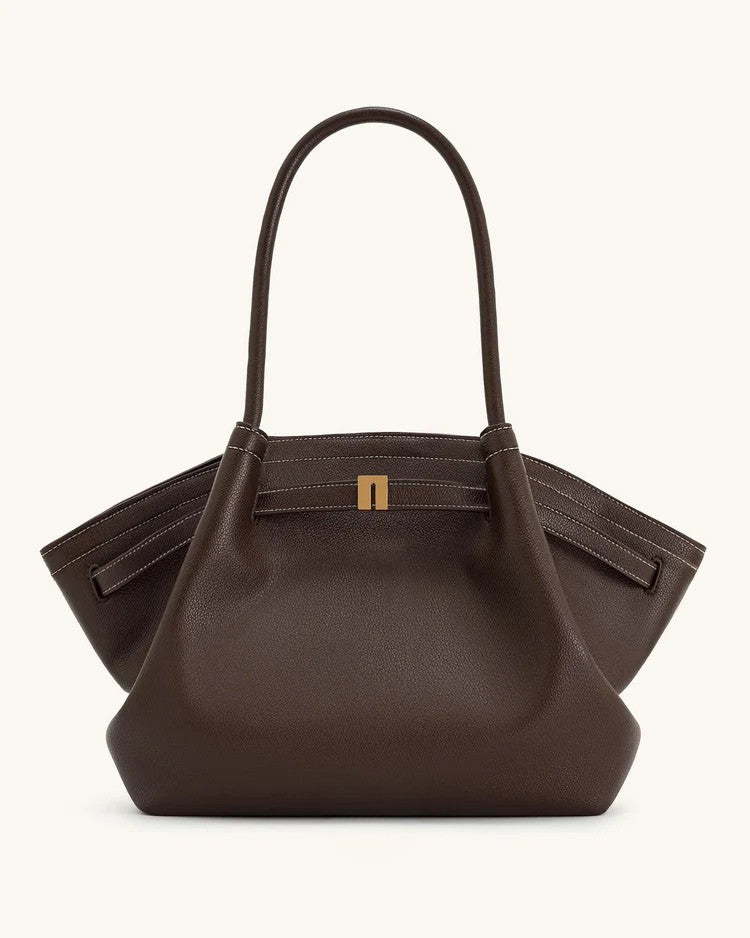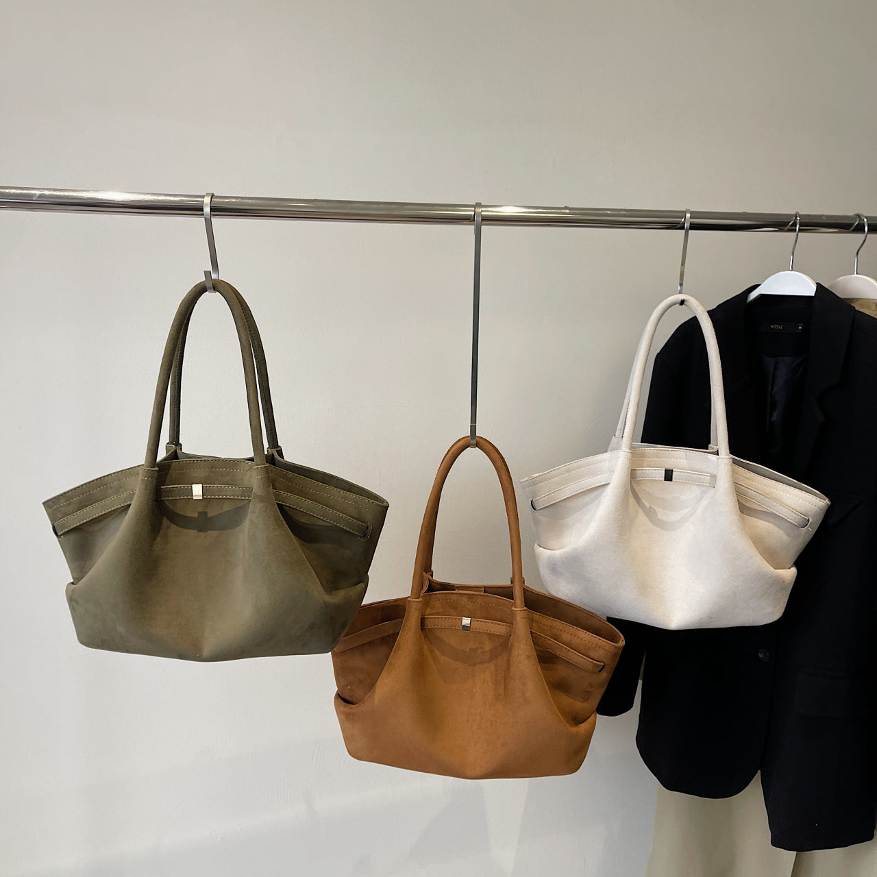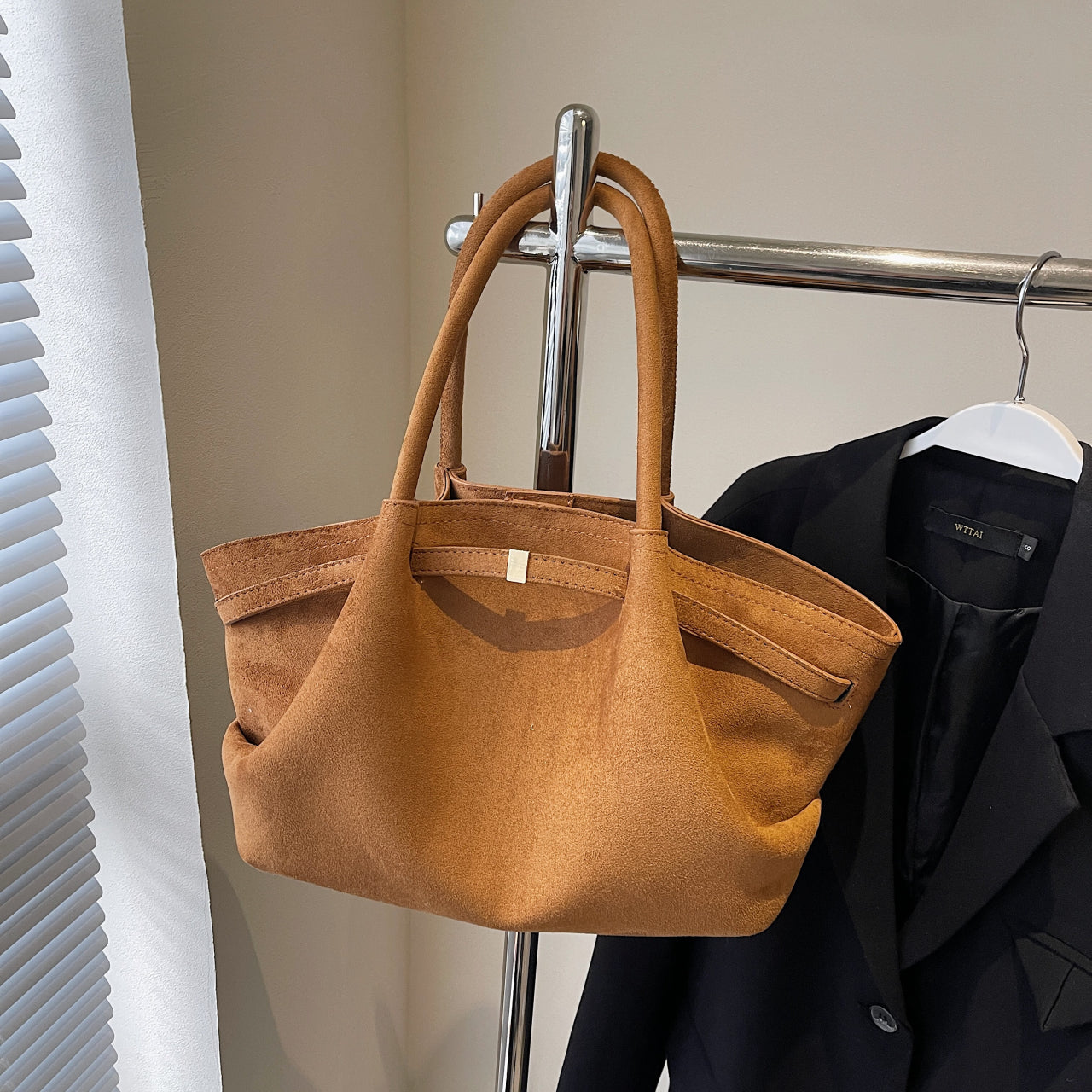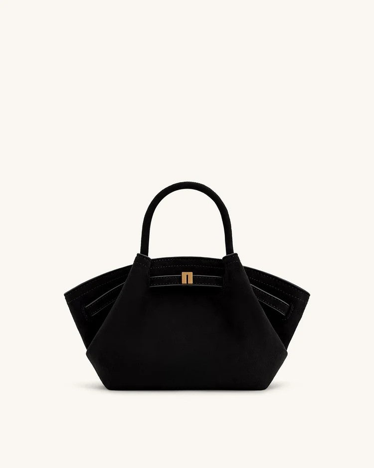 Morbida eleganza vegana: pelle scamosciata cruelty-free, design fluido e versatile, perfetta dal giorno alla sera con manici resistenti e capienza su misura.